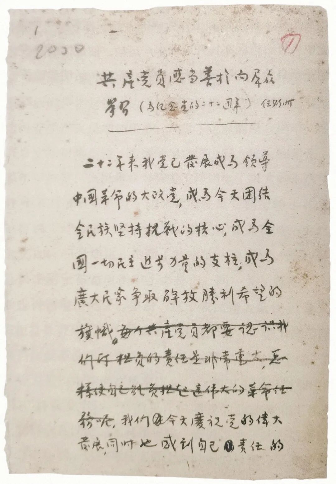 任弼時同志于1943年6月寫下的《共產(chǎn)黨員應當善于向群眾學習》。中央檔案館藏