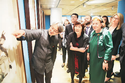 北京畫院副院長(zhǎng)、北京畫院美術(shù)館館長(zhǎng)吳洪亮向中國駐希臘大使章啟月、希臘文化和體育部部長(zhǎng)莉娜·佐尼女士介紹齊白石的畫作
