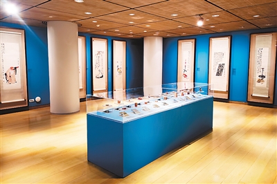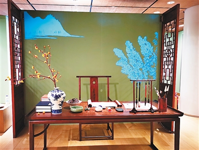為了營(yíng)造中國人讀書作畫的現(xiàn)場(chǎng),展覽專門復(fù)原了一個(gè)中式書房,觀眾可拍照留念,也可在此手持毛筆畫卷,體驗(yàn)中國人的書寫方式。