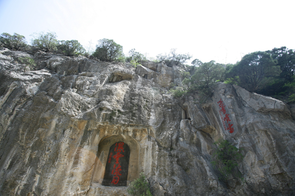 乳竇泉:在青蓮寺外左側(cè)石崖下有一天然水池,名曰“乳竇泉”。池水清澈晶瑩,水位常年如一,澇不增, 早不減,不取不增,多取不減。其上石壁,陡峭如削,直插云端,上有約20多米寬的巖石,有經(jīng)水多年沖刷、侵蝕留下的痕跡。再看峭壁上的石刻,上有“瀑布飛泉”及“山吐天邊月,溪流石上云”的字樣,據(jù)考證這些是北魏時期遺留下的。 由此可見, 當(dāng)時瀑布之壯觀, 用李白的“飛流直下三千尺,疑是銀河落九天”的詩句宋形容,再恰當(dāng)不過了。