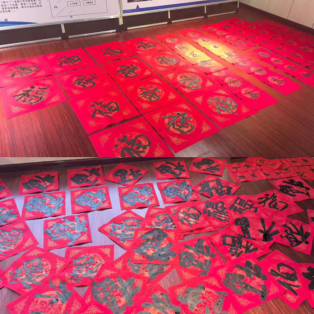 活動現(xiàn)場,墨香四溢,熱鬧非凡。市書法協(xié)會的書法家們激情滿懷,揮毫潑墨,筆鋒或剛勁有力,或飄逸灑脫,轉(zhuǎn)眼間,一個個飽滿的“!弊帧⒁环⒁饧榈拇郝(lián)便躍然紙上。職工們圍在一旁,目不轉(zhuǎn)睛地欣賞著書法創(chuàng)作過程,不時發(fā)出陣陣贊嘆。一些職工忍不住親自上手,寫出的字跡或蒼勁有力,或娟秀工整,絲毫不輸專業(yè)水準,引得周圍人紛紛豎起大拇指。大家還興致勃勃地挑選自己心儀的對聯(lián),歡聲笑語回蕩在現(xiàn)場,氣氛其樂融融。