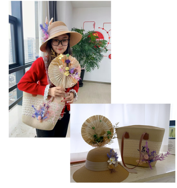 伴隨著悠揚的輕音樂旋律,大家聚精會神地聆聽老師的講解,同時巧手匠心,將所學(xué)技巧融入實踐,在“帽美如花”、“包你幸!、“晉扇晉美”三個環(huán)節(jié),親手裝飾出專屬自己的夏日限定飾品。通過草編與花藝的巧妙結(jié)合,這些作品在形態(tài)、色彩與質(zhì)地上展現(xiàn)出豐富多變的優(yōu)雅風(fēng)姿。在芬芳馥郁的花香環(huán)繞中,大家不僅感受到了大自然的韻味,更領(lǐng)悟到了生活的藝術(shù)與真諦。作品完成后,大家興奮地相互展示,彼此欣賞,紛紛舉起自己的得意之作合影留念,定格下了這一美好而難忘的瞬間。