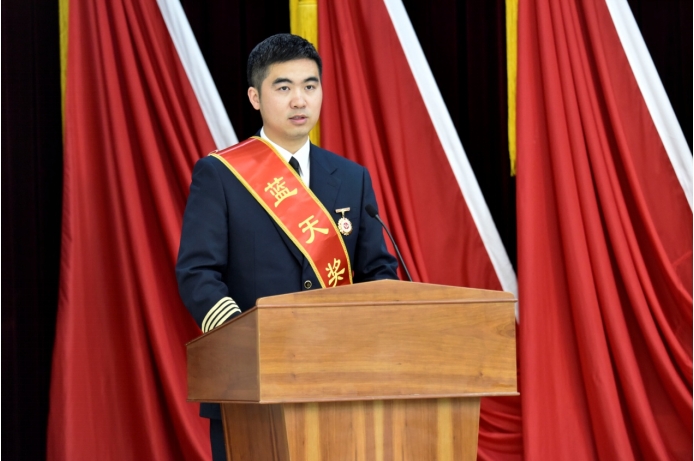 藍(lán)天獎?wù)芦@得者、國航飛行總隊(duì)三大隊(duì)一中隊(duì)中隊(duì)長王雨寒宣讀倡議書