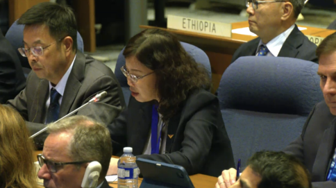 中國(guó)民用航空局副局長(zhǎng)梁楠在大會(huì)上發(fā)言(國(guó)際民航組織官網(wǎng)直播畫面)